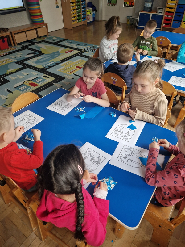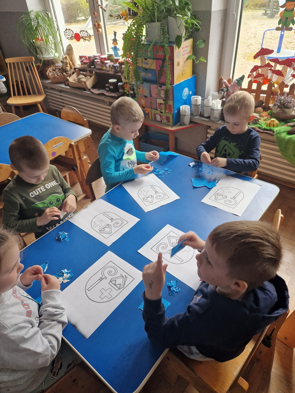 Zadaniem dzieci było wypełnienie konturu herbu techniką wydzieranki. Wszystkie dzieci starannie i estetycznie wykonały pracę.