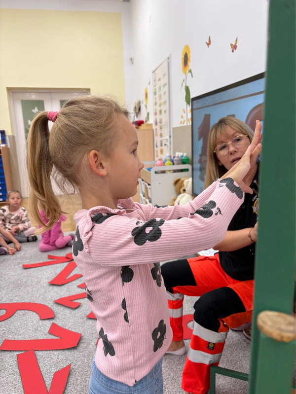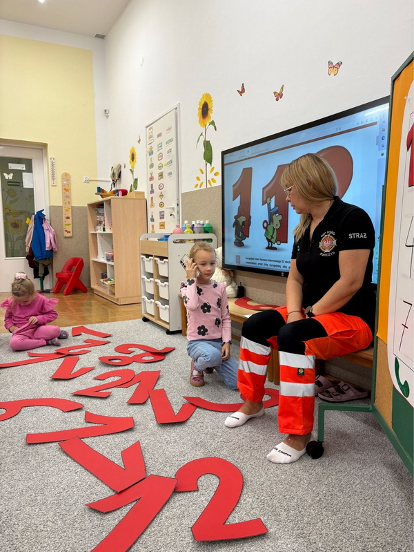 Nasze przedszkolaki nauczyły się jaki jest numer alarmowy oraz jak poprawnie wykonać taki telefon. Ćwiczyliśmy rozmowy telefoniczne i rozpoznawaliśmy sytuacje w których należy wezwać pomoc.