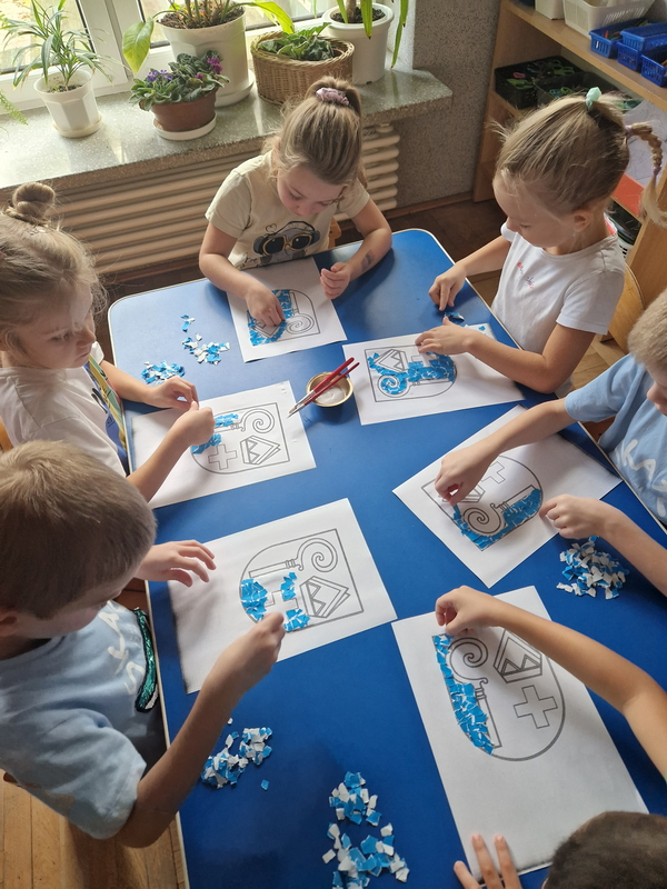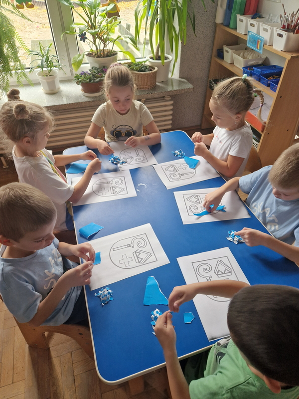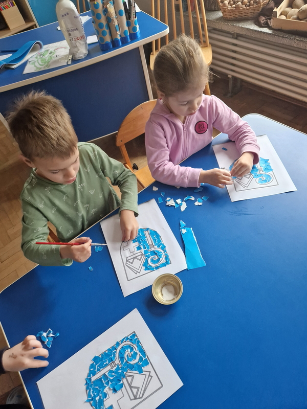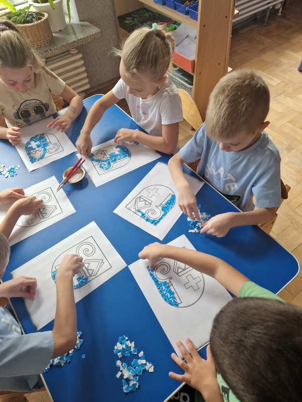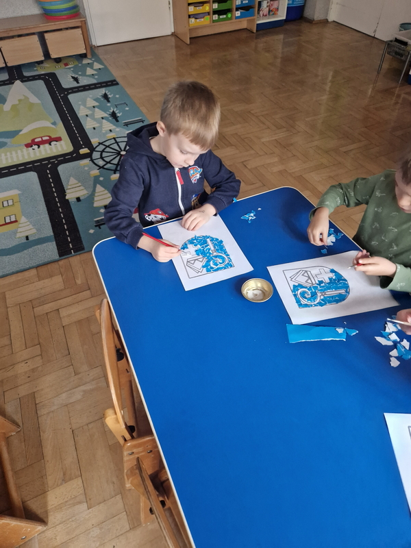 Zadaniem dzieci było wypełnienie konturu herbu techniką wydzieranki. Wszystkie dzieci starannie i estetycznie wykonały pracę.